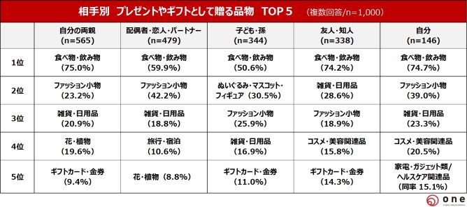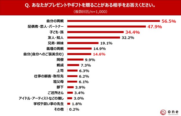 プレゼントを贈る相手として最も多かったのは「自分の両親」56.5%、次いで「配偶者・恋人・パートナー」47.9%、「子ども・孫」34.4%となりました。
