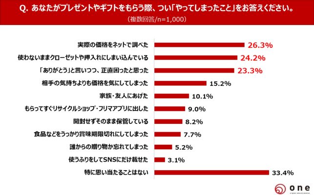 プレゼントやギフトをもらう際、つい「やってしまったこと」TOP3は、1位「実際の価格をネットで調べた」26.3%、2位「使わないままクローゼットや押入れにしまい込んでいる」24.2%、3位「『ありがとう』と言いつつ、正直困ったと思った」23.3%。