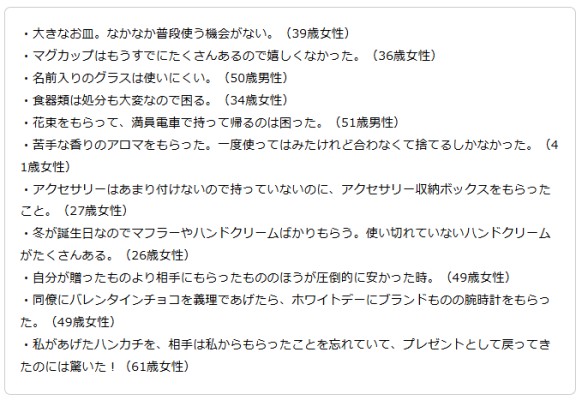 「使う機会のない大きなお皿」「マグカップはありすぎてもう要らない」「名前入りのグラス」など食器類は置き場所・処分にも困る様子がうかがえました。相手の好みや生活導線に合わないものはNGとなるようです。