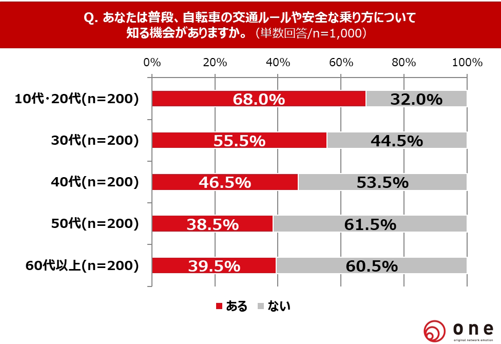 10代・20代は「ある」68.0%が他の年代と比べて高い結果に。40代以降で「ない」が半数を超え、50代と60代以上は6割超が「ない」と回答。自転車歴が長いほど知っているルールのアップデートがされていない?