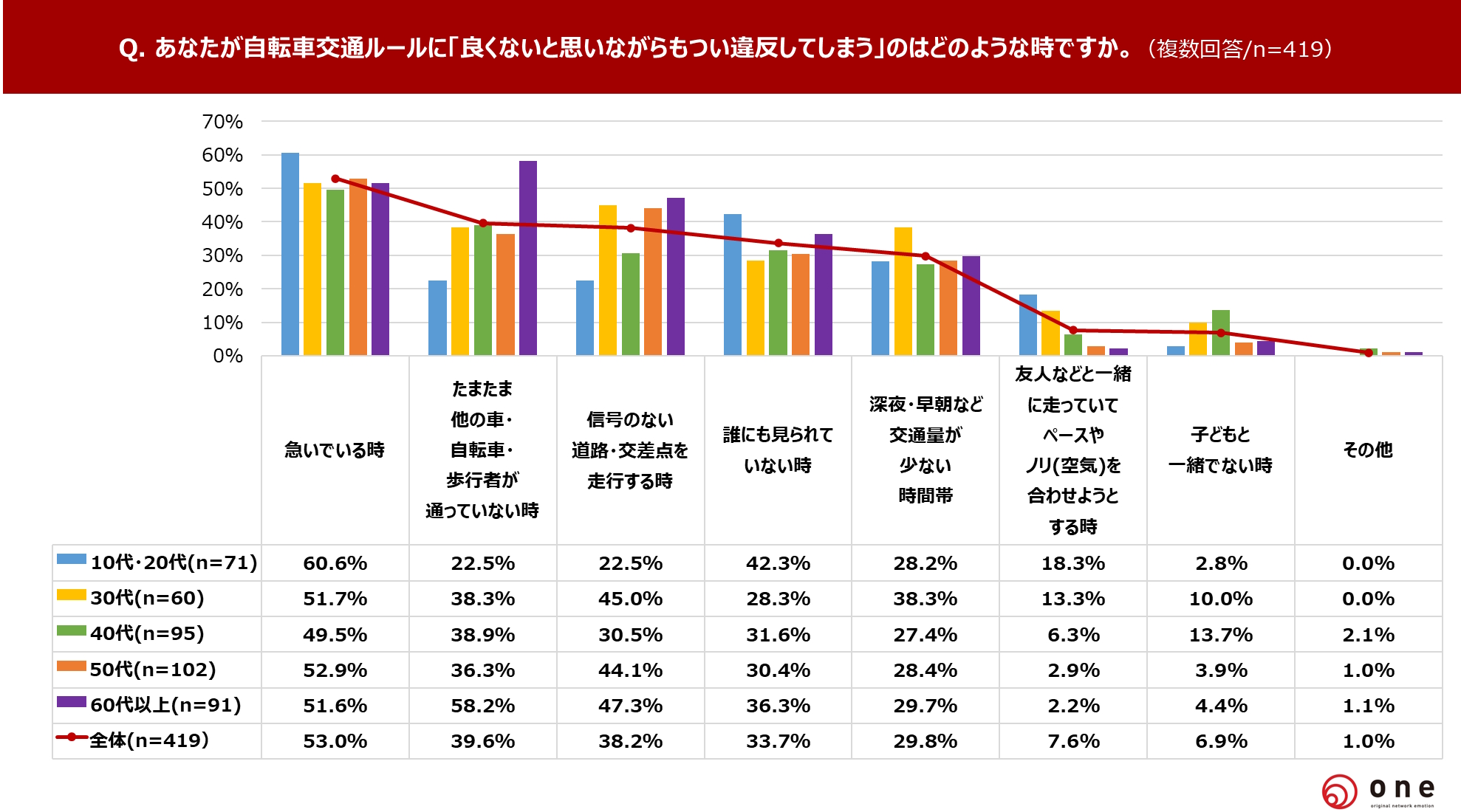 “つい違反”してしまうのは「急いでいる時」53.0%が最多。60代以上は「たまたま他の車・自転車・歩行者が通っていない時」58.2%が他の年代と比べて高いことが明らかになりました。