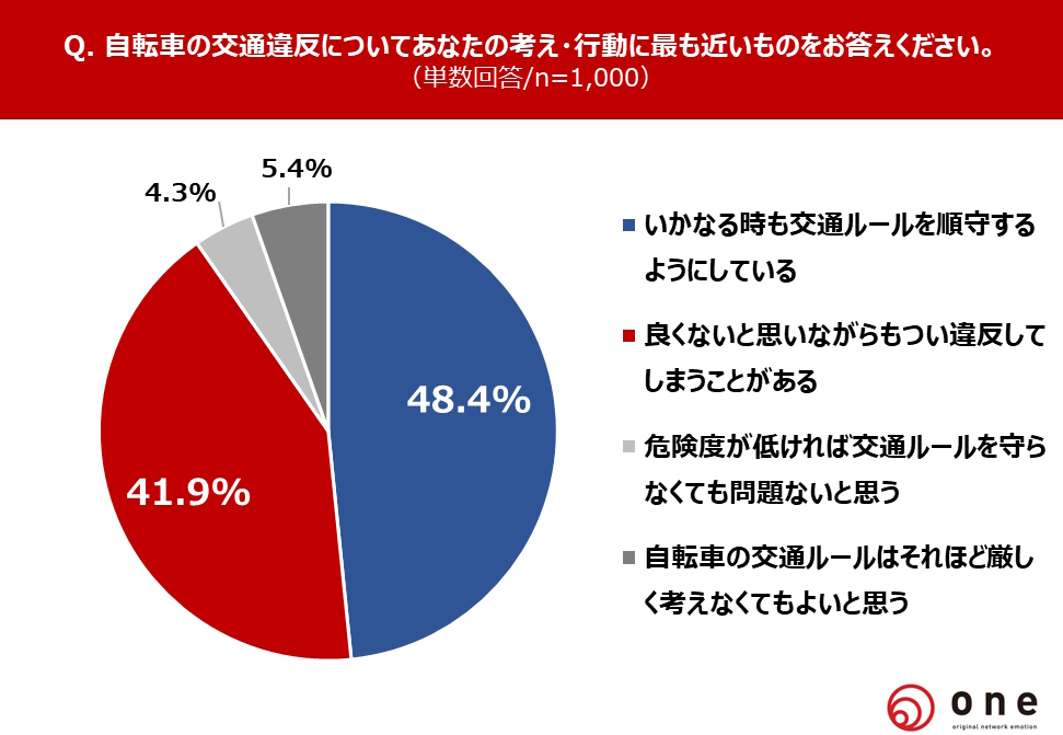 自転車の交通違反についての考え・行動を聞くと、「いかなる時も交通ルールを順守するようにしている」48.4%が最多でしたが、「良くないと思いながらもつい違反してしまうことがある」41.9%と、4割超が“つい違反”をしている実態が明らかとなりました。